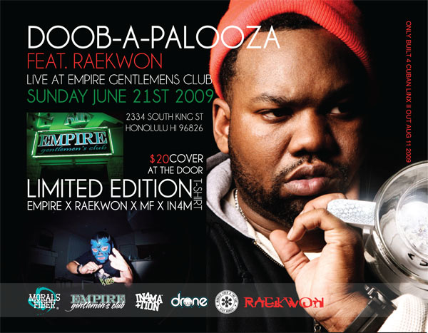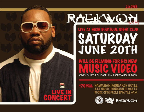 Raekwon from the Infamous Wu-Tang Clan will be in town for the weekend. He will be playing on Saturday at Hush night club and Sunday at Empire Gentleman’s club. For the event at Empire Gentleman’s club a limited tee will be given to those who attend only while supplies last. He will be also filming in Hawaii for his video that will be off of his new album Built for Cuban Linx 2 that will come out on Aug. 11th 2009