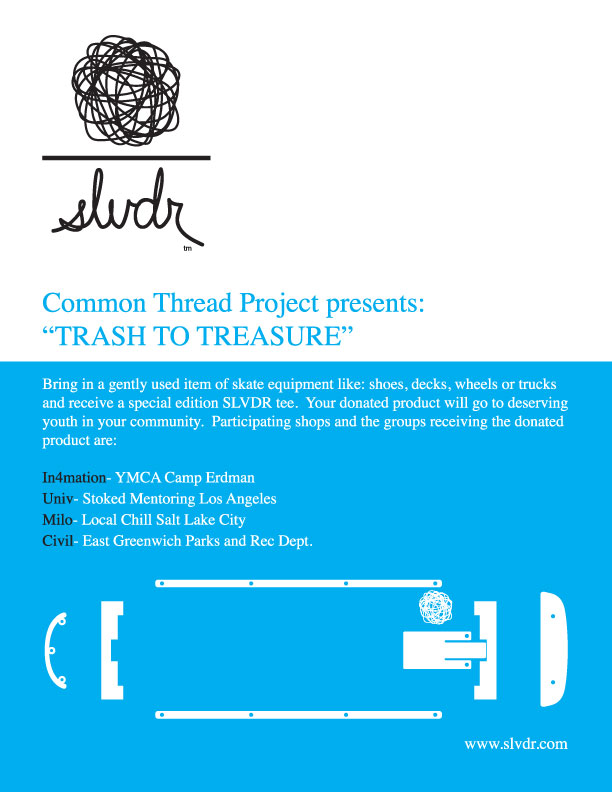 Common Threads Projects presents “Trash to Treasure”. Slvdr with its always sick spin on design also in it for the youth and skateboard community. Bring in a gently used item of skate equipment like : shoes, decks, wheels, or trucks and receive a special edition SLVDR tee. Your product will go to deserving youth in the community.
